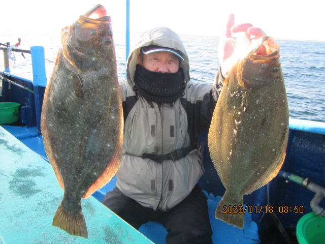 1月18日 (日) ヒラメ 0.5~3.2kg 0~6枚 他に スズキ マゴチ 濃い所を探して 漁場を広く見る 大ヒラメ 3.2kg 2.6kgを 初め釣る ポイント多くして釣る;