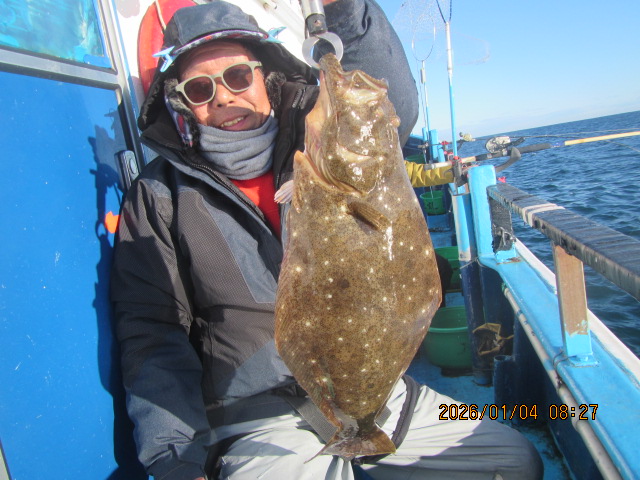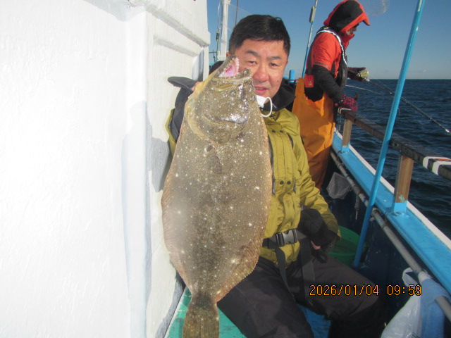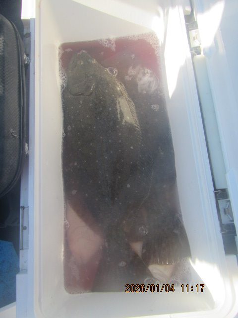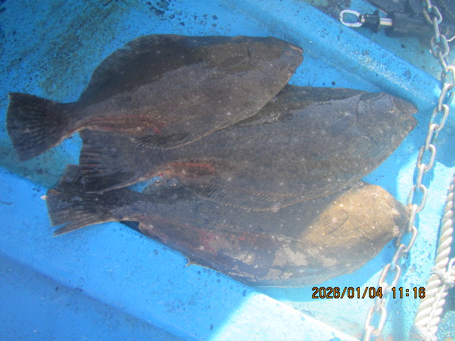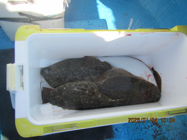 5。7kgの特ヒラメ 初め4.2kg 3.0kg 2.7kgの大ヒラメ釣る 新つぱや 新しい漁場を攻める ブザーなる毎に 7個の玉網で 間段なく 取り込む;