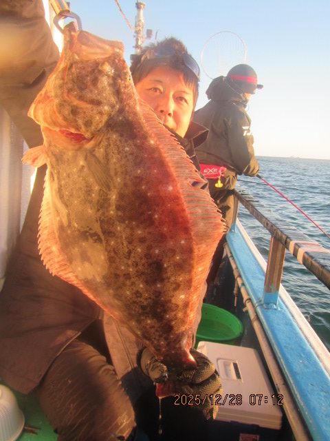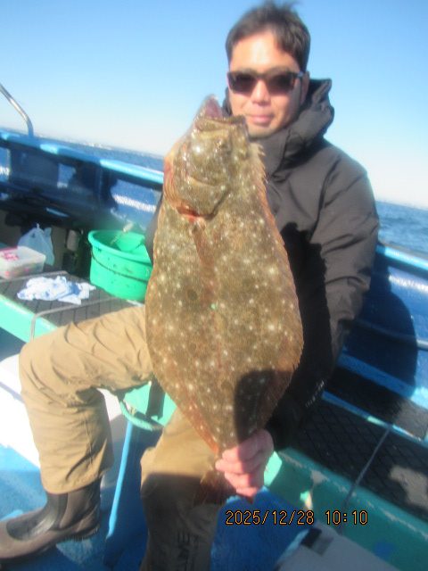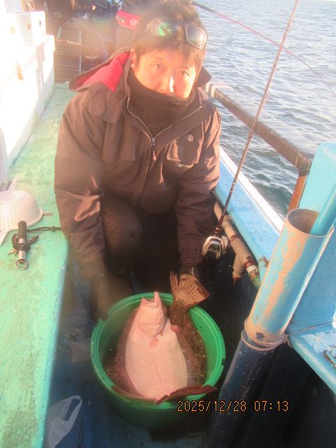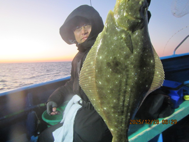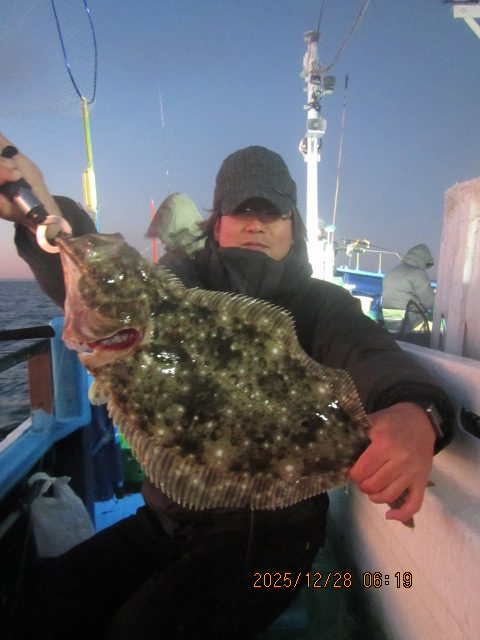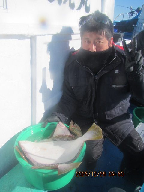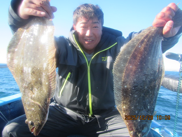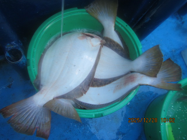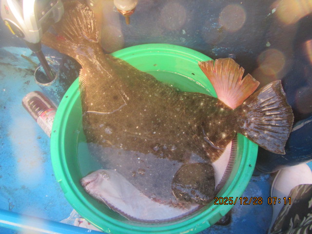 ヒラメ釣り 12月28日  ヒラメ 0.5~4.6kg 0~11枚 他に マゴチ スズキ マハタ ワラサ カサゴ 濃い群れへ 乗せ乗せ釣る; 7個の玉網で取り込む;